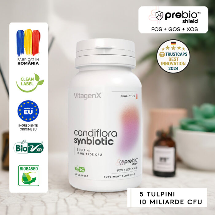 Candiflora Synbiotic este o formulă avansată ce combină 5 tulpini probiotice și un amestec prebiotic PrebioShield, special conceput pentru a preveni și combate candidoza, susținând echilibrul microbiotei.